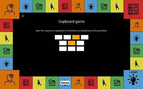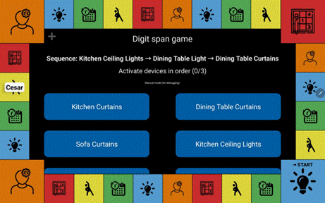 The game consists of different kinds of questions and tasks, including multiple minigames that are adaptations of neuropsychological tests to a smart home environment. The game connects with the smart devices in HomeLab via the open source OpenHab software and allows for interaction with objects such as lights, cupboards, curtains, fridge, and more.