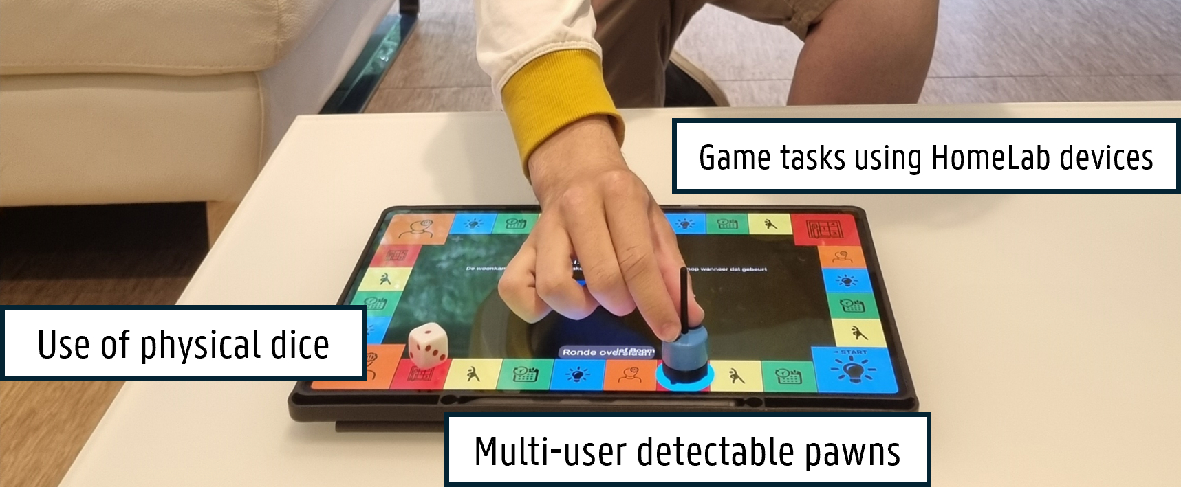 To improve the game's tactility and introduce a new measurement point for analysis, physical pawns were designed using a conductive 3D printing material, ensuring low-cost production. Multi-user detection is achieved through distinct pawn bases. Additionally, commercial BLE dice are supported. These features, along with the smart integrations, are optional and can be activated on a per-device basis, allowing for multiplayer interaction with any user.